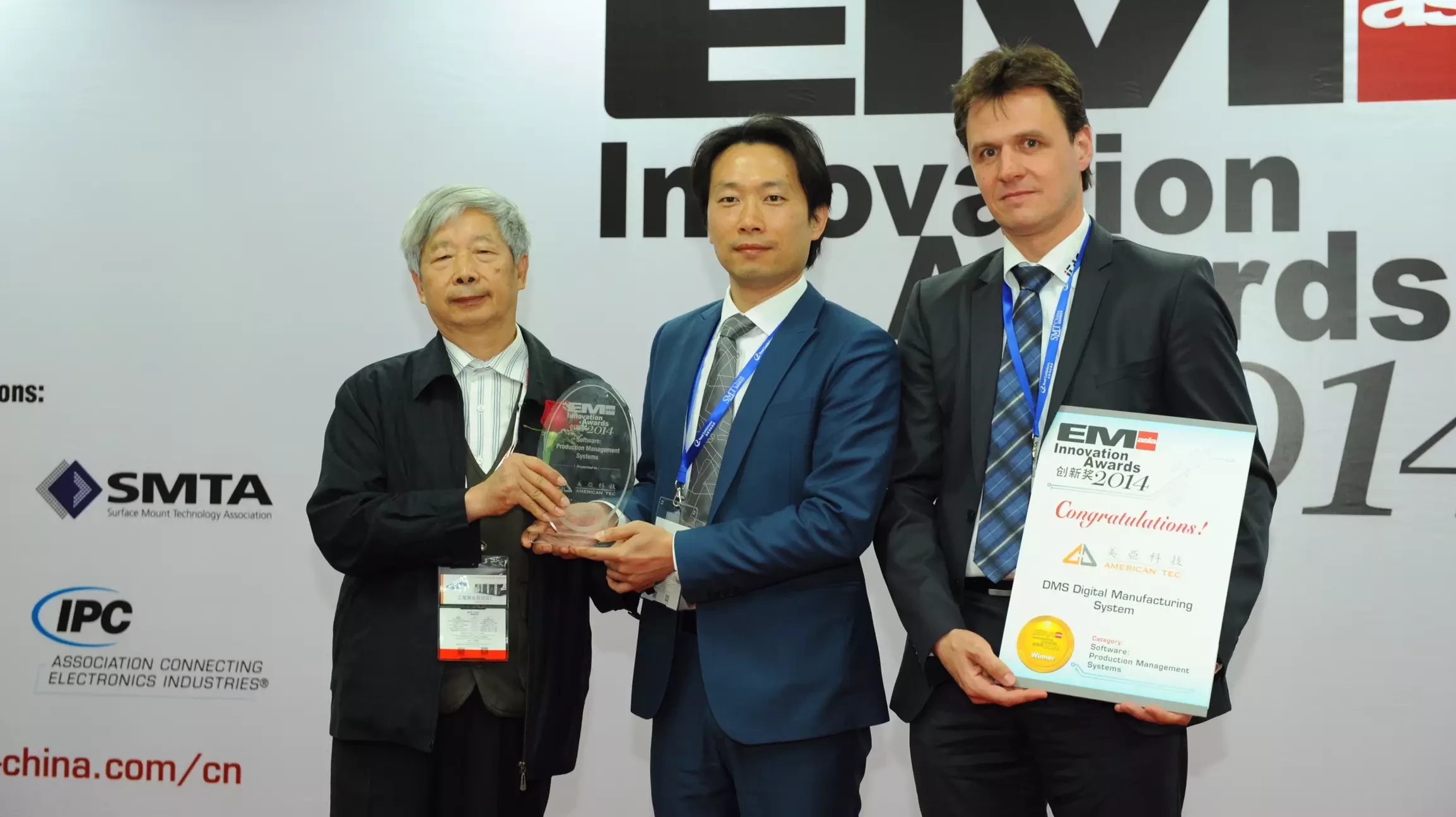 Der „9. EM ASIA Innovation Award“ wurde im Zuge der Nepcon Shanghai in der EXPO Messehalle in Shanghai verliehen. Diese Auszeichnung prämiert neue Produkte, Software und Equipment, die im Jahr 2013 veröffentlicht wurden, und unterstützt die Entwicklung sowie Neueinführung von Innovationen in der asiatischen Elektronikfertigung. Dabei erhielt das DMS von American Tec in der Kategorie „Produktionsmanagementsystem“ auf Grund seiner hervorragenden Leistung und des erfolgreichen Praxiseinsatzes die begehrte Auszeichnung.